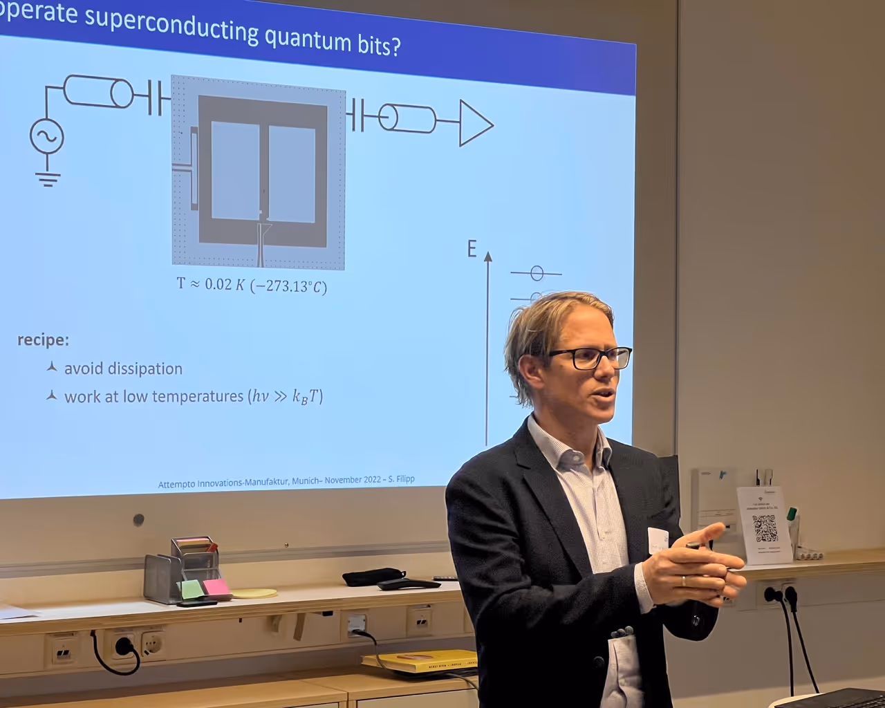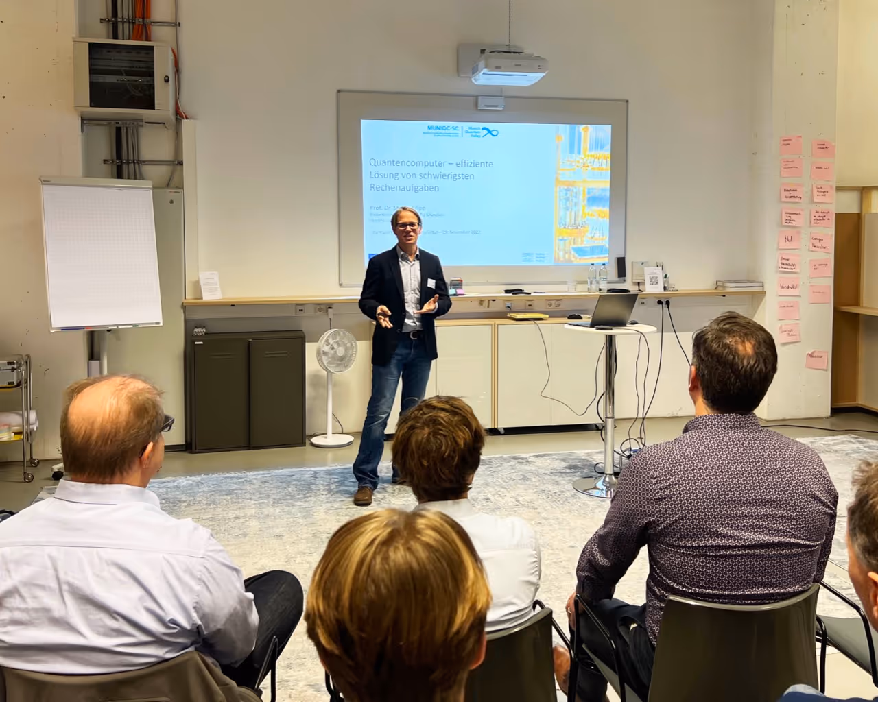 Ende November durften wir Herrn Professor Dr. Stefan Filipp (Professor für Technische Physik an der TU München und Direktor am Walther-Meißner-Institut der Bayerischen Akademie der Wissenschaften) mit seinem spannenden Vortrag zum Thema „Quantencomputer – effiziente Lösung von schwierigsten Rechenaufgaben” willkommen heißen. In vielen Fällen aus Wirtschaft und Wissenschaft stoßen herkömmliche Rechner mittlerweile an ihre Grenzen. Dagegen versprechen Quantencomputer basierend auf den Gesetzen der Quantenmechanik einige schwierige Rechenaufgaben, die selbst zukünftige Hoch- und Höchstleistungsrechner überfordern, lösen zu können. Hierzu erläuterte Herr Professor Dr. Filipp zunächst die Funktionsweise von Quantencomputern, um anschließend auf den derzeitigen Stand der Technik und die damit einhergehenden Herausforderungen einzugehen. Zudem stellte er neue Anwendungsgebiete vor, die sich daraus ergeben.